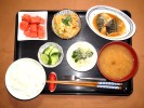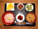 まぐろ丼(刻み海苔、キュウリわさび乗せ)、味噌汁(白菜、なめこ)、ブロッコリー胡麻ドレがけ、うずら豆煮、フルーツ:ネーブルオレンジ |