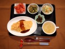 チキンオムライス(特製デミソース)、オニオンコンソメスープ、コールスローサラダ(キャベツ、人参、キュウリ)、ゴーヤ炒め(豚肉、たまご)、キュウリパリパリ漬け、フルーツ:北海道富良野産スイカ |