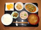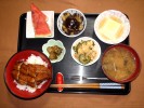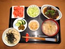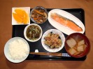 ごはん、味噌汁(とうがん、松山あげ)、チリ産鮭の塩焼き、ぜんまいの煮物(人参、こんにゃく、あげ、竹輪、さつま揚げ)、揚げ茄子のポン酢がけ(おかか)、もずく酢(キュウリ)、フルーツ:ネーブルオレンジ |