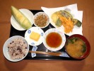 お赤飯(ごま塩)、味噌汁(豆腐、なめこ、三つ葉)、天ぷら盛り合わせ(天つゆ、さつま芋、かぼちゃ、茄子、人参、レンコン、ピーマン、竹輪いそべ)、金平ごぼう、厚焼き玉子、フルーツ:メロン |