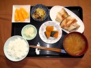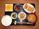 ごはん、味噌汁(白菜、しめじ、あげ)、揚げギョーザ(ポン酢がけ)、レンコンの炒め煮、かぼちゃいと子煮、キュウリパリパリ漬け、「フルーツ:ネーブルオレンジ |