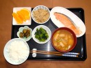 ごはん(ゆめぴりか)、味噌汁(豆腐、あげ、長ネギ、なめこ)、チリ産鮭の塩焼き、れんこん炒め煮、菜の花の辛子和え、キュウリパリパリ漬け、フルーツ:ネーブルオレンジ |