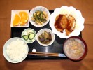 ごはん、味噌汁(泊代、なめこ)、豆腐ハンバーグ和風ソースがけ(大根おろし、なめ茸、刻みオクラ)、うの花(人参、あげ、竹輪、さつま揚げ、椎茸、むき枝豆、玉子、長ネギ)、とうがんカニカマあんかけ(グリーンピース)、キュウリパリパリ漬け、フルーツ:ネーブルオレンジ |