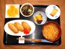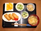 ごはん(ゆめぴりか)、味噌汁(キャベツ、椎茸、あげ)、ミートコロッケ&アジフライ(千切りキャベツ、特製ソース)、茄子の鉄火味噌、ゴーヤ炒め(豚肉、たまご)、かぶとキュウリとみょうがの梅しそ漬け、フルーツ:ネーブルオレンジ |