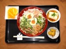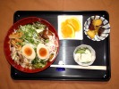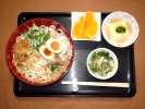 冷やしうどん(細めん、キュウリ、カニカマ、揚げ玉、煮あげ、煮たまご、カイワレ、みょうが、万能ネギ)、ブロッコリー胡麻ドレがけ、玉子豆腐(三つ葉)、フルーツ:ネーブルオレンジ |