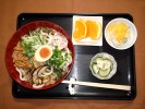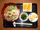 冷やしうどん(中細めん、キュウリ、カニカマ、揚げ玉、煮あげ、煮たまご、カイワレ、みょうが、万能ネギ)、菜の花の辛子和え、厚焼き玉子、フルーツ:ネーブルオレンジ |