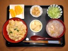 親子丼(とり肉、たまねぎ、なると、たまご、三つ葉)、味噌汁(キャベツ、あげ)、キュウリの酢の物、白花いんげん豆煮、長芋のポン酢漬け、フルーツ:ネーブルオレンジ |