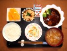 ごはん、味噌汁(白菜、キャベツ、あげ)、煮込みハンバーグ(ブロッコリー、マッシュルーム)、仙台のふたまごとじ(三つ葉)、コールスローサラダ(キャベツ、人参、キュウリ)、丸美屋おかかふりかけ、フルーツ:ネーブルオレンジ |