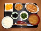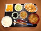 ごはん、味噌汁(白菜、あげ)、麻婆豆腐(豚挽肉、万能ネギ)、大根とシーチキン煮(大根葉)、キュウリの酢の物、つぼ漬けこんぶ、フルーツ:ネーブルオレンジ |