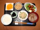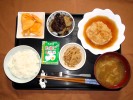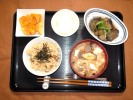 ごはん、味噌汁(白菜、なめこ)、豆腐の挽肉あんかけ、切り干し大根煮(人参、あげ、竹輪、さつま揚げ)、菜の花の辛子和え、つぼ漬けこんぶ、フルーツ:ネーブルオレンジ |