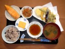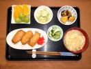 きの子ごはん(刻み海苔)、味噌汁(白菜、あげ)、茄子の揚げびたし(三つ葉)、酢の物(キュウリ)、玉子焼き、つぼづけ昆布、フルーツ:バナナ(ブルーベリーソース・生クリーム) |