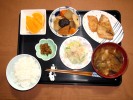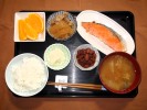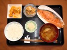 ごはん、味噌汁(白菜、椎茸)、チリ産の鮭の塩焼き、がんも含め煮、大根おろし・甘酢しょうが和え、フルーツ:柿 |