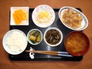 ごはん、味噌汁(白菜、たまねぎ、しめじ)、豚肉と生姜焼き(玉ネギ)ポテトサラダ(人参、キュウリ、ロースハム、ゆでたまご)、もずく酢(キュウリ、キュウリ中華炒め、フルーツ:ネーブルオレンジ |