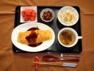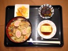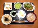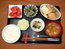 ごはん、味噌汁(白菜、なめこ)、豆腐ハンバーグ和風ソースがけ(大根おろし、なめ茸)、レンコンの金平、茄子の胡麻味噌田楽、丸美屋たまごふりかけ、フルーツ:柿 |