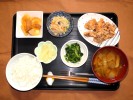ごはん、味噌汁(白菜、椎茸)、とりの唐揚げ、うの花(人参、椎茸、あげ、竹輪、さつま揚げ、長ネギ、たまご、むき枝豆)、菜の花の辛子和え、新潟たくあん、フルーツ:柿 |