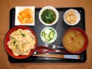 親子丼(とり肉、たまねぎ、なると、たまご、三つ葉)、味噌汁(白菜、なめこ)、ほうれん草なめ茸和え、白花いんげん豆煮、かぶとキュウリ・みょうがの梅しそ漬け、フルーツ:柿 |