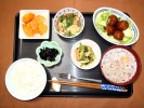 ごはん、味噌汁(茄子、松山あげ、みょうが)、ミートボール甘酢あんかけ(水菜、マヨネーズ)、レンコンの炒め煮、酢の物(もやし、キュウリ、竹輪、白すり胡麻)、つぼ漬けこんぶ、フルーツ:ネーブルオレンジ |