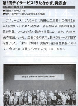 「デイサービスうたなかま」も10月1日で、5周年を迎える事が出来ました。これもご利用者の皆様、ご家族様、関係者の皆様方のお力だと思っています。本当にありがたく、感謝の気持ちしかありません。いつも思いだすのが、平成24年10月1日に2名のご利用者様とスタートした時の事です。5年間いろいろありましたが、6年目も初心忘れずに、大きな事は出来ませんが、スタッフ一同、コツコツと一生懸命に頑張って行きたいと思います。今後も「うたなかま」を末永く、支えて頂きますよう、よろしくお願い致します。