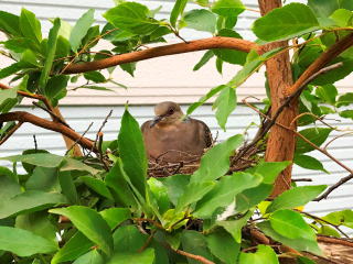植木屋さんが枝を切っていると何とハトがタマゴを温めていました。本当にビックリです。じっと雨風に耐えて、一生懸命の親ハトは偉いなぁ~と思いました。ヒナがかえるまで、頑張って欲しいと思います。