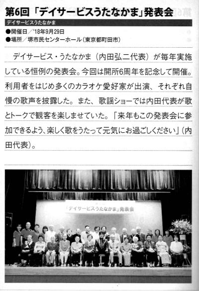 23日(火)から26日(金)まで、10月の行事として、あの感動をもう一度「第6回デイサービスうたなかま発表会:写真&ビデオ上映会」を行い、皆さんとワイワイ盛り上がりました。本当に改めて写真やビデオで見直すと感動、感激につきます。皆さんの一生懸命に取り組んで頂いた姿を見て、これからも「うたなかま」を頑張って行かなければと改めて思いました。皆さん来年の第7回発表会に向けて歌を楽しく、頑張って行きましょう。本当にありがとうございました。感謝。感謝です。