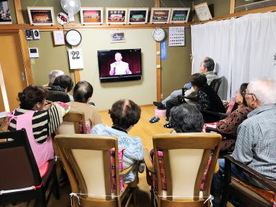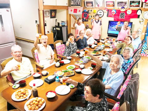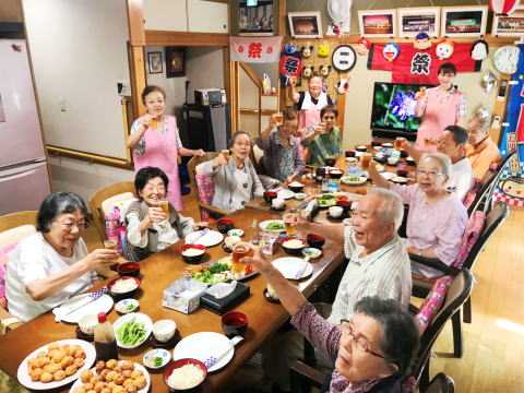 今日から始まりました。8月行事「第8回うたなかま夏祭り」の1回目。昼食は、ノンアルコールビールで、乾杯して、夏祭りが始まりました。昼食は、夏祭り食(Today Lunch Menu参照)を楽しんで頂きました。その後、ヨーヨーすくい、スーパーボールすくい、輪投げ、ボール投げと豪華景品付で盛り上がりました。3時のお茶は、カキ氷(メロン、レモン、練乳、あずき)をお腹一杯、食べて頂きました。皆さん沢山の笑顔が見られて本当に良かったです。と言う事で、あっと言う間の楽しい1日をお過ごし頂けたかと思います。明日も行います。 のかと思いました。画面が切り替わらないので、新聞を横と縦に貼り付けて、タレントが見えないようにして、副音声で観戦しました。もし行うのであれば、裏チャンネル(サブチャンネル、副音声等)でやって欲しいと切に思いました。