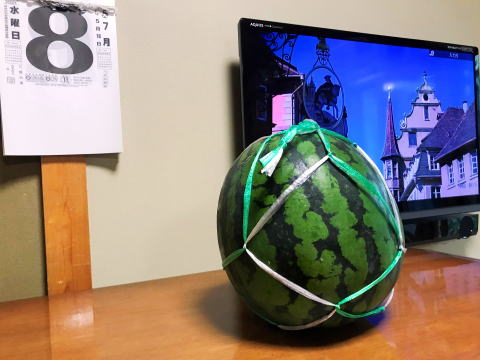 来週の昼食で、今日のフルーツとしてお出しする予定の「7Lスイカ」です。メチャクチャ大きく、重たいです。「うたなかまの皆さん」の「美味しい顔」が楽しみです。