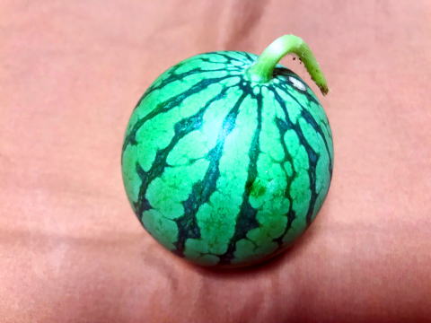 「うたなかまで」で採れた「スイカ」です。本当はもっと大きくなるはずでしたが、ミニサイズとなりました。「うたなかまの皆さん」にも見て頂き、「可愛いね」と言って頂き、目の保養をして頂きました。