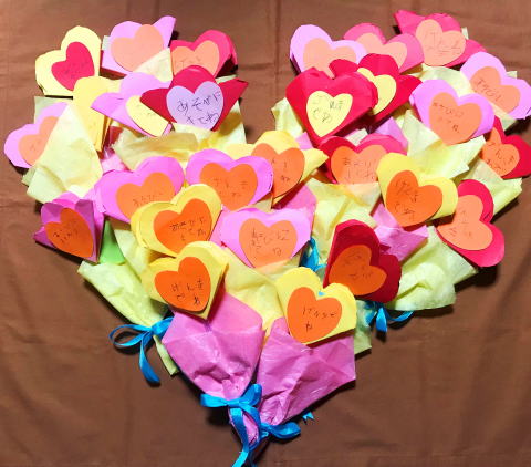 毎年「小山保育園の敬老会」に参加する事を楽しみにしておりましたが、新型コロナウイルスの感染拡大により、今年は行く事が出来ず、残念に思っていたところ、高橋園長先生が園児が作ってくれた、ハートに「あそびにきてね」「げんきでね」等のメッセージが書かれた作品を届けにきてくださいました。園児のみんなが一生懸命に作ってくれたと思うと本当に有難く、とても嬉しかったです。早速「うたなかまの皆さん」にお渡ししたいと思います。来年は「コロナ」が終息し、是非「小山保育園の園児のみなさん」とお会いして、歌やお遊戯等、沢山の交流が出来る事を願いたいです。高橋園長先生、お忙しい中、ありがとうございました。今後共、よろしくお願い致します。