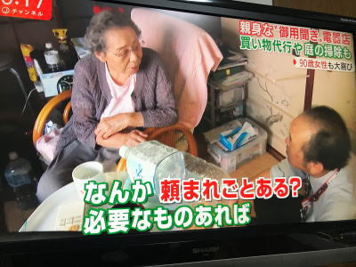 テレビ朝日「スーパーJチャンネル」で、18時15分から「でんかのヤマグチさん」の特集があり、「うたなかまのkさん」が出演しました。地域密着の「でんかのヤマグチさん」、顧客の心を掴む手法は凄いなぁ~と感心しました。「うたなかまのKさん」、テレビでも若々しく, お話もお上手でとても良かったです。特集も良く構成されていました。是非、「うたなかまの皆さん」とも見たいと思います。座長も自分が出演したかのように嬉しかったです。